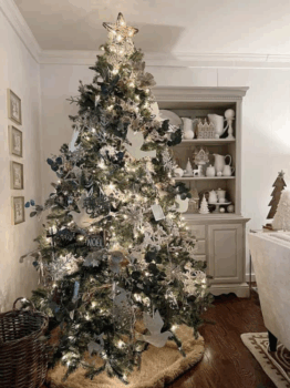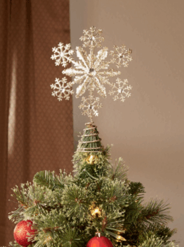 A snowflake topper creates a cool winter wonderland effect. Crystal-style snowflakes shimmer beautifully under lights, while glittery or frosted ones add a frosty charm. This topper is perfect for blue, white, and silver themed trees that capture the beauty of winter.