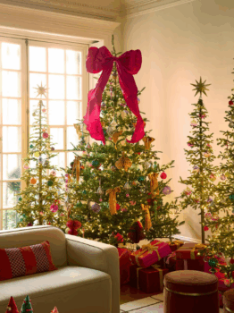 Large ribbon bows are trendy, elegant, and incredibly stylish. Velvet bows add luxury, satin bows bring softness, and metallic ribbons create festive shine. The ribbon tails cascading down the tree give it a beautifully finished designer look.