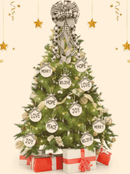 If you want something truly personal, use your family’s initials as the topper. You can pick wooden monograms, glitter initials, or LED-lit letters. This makes your Christmas tree feel thoughtful, custom, and meaningful for your family celebrations.