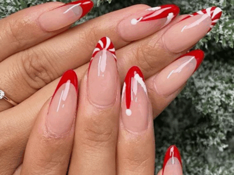 Candy cane nails are a fun and festive twist on the classic French manicure. To achieve this design, paint the tips of your nails with alternating red and white stripes, mimicking the look of a candy cane. This Christmas nail design is perfect for those who love classic, clean lines but want to add a little holiday cheer to their nails.